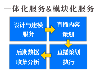 我们拥有深厚的技术储备,以及成熟的管理团队与运营团队。因此我们可以向B端提供模块化或一站式的技术保障服务、形象包装、贴合市场需求的运营方案与策划实施、直播后的数据跟踪与分析等服务。