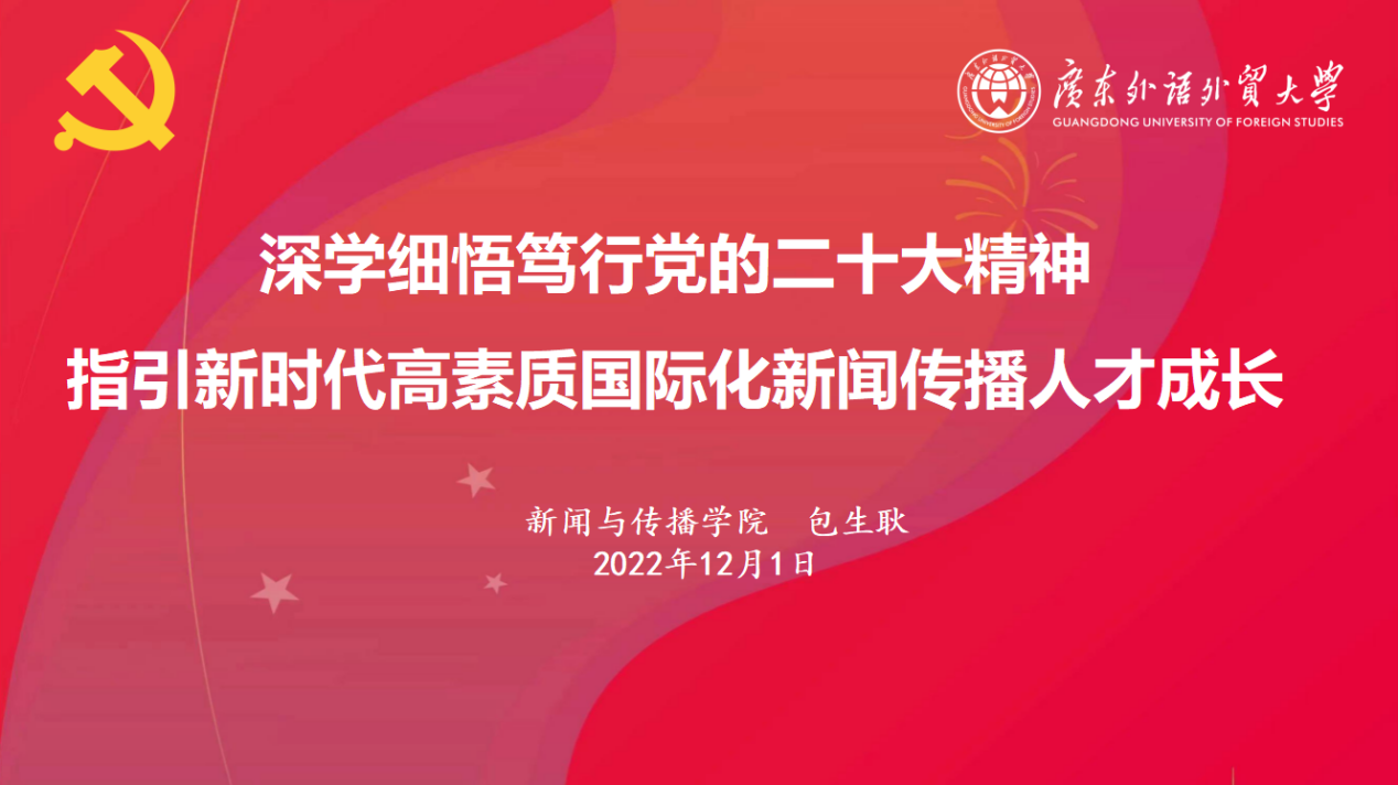新闻学院院长侯迎忠教授作《认真学习党的二十大精神,扎实推进学科建设和人才培养》主题宣讲。本场宣讲由学院副院长罗坤瑾教授主持。侯迎忠教授从理论和工作两个层面切入,带领与会人员仔细体悟党的二十大报告内涵,深入学习党的二十大精神。侯迎忠院长指出,要扎实推进学科建设与人才培养,建设立足广东、面向世界的全媒体国际传播教学科研平台,培养立足湾区、放眼世界的国际化新闻传播人才。最后,侯迎忠院长强调,全院师生要认真学习贯彻党的二十大精神,高举中国特色社会主义伟大旗帜,在新征程中接续奋斗,切实推动学院各项工作高质量发展。