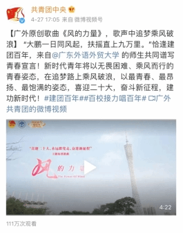 4月27日,由我院播主1901班学生丘嘉莹参与作词作曲的原创歌曲《风的力量》上线发布,引起了广泛关注和热烈反响,共青团中央官方微信、微博和《中国共青团杂志》、《中国青年报》、共青团广东省委、学习强国、南方+、广东省流行音乐协会等单位和媒体纷纷转载或刊发,收听收视量超百万次,恰逢建团百年之际,青年学子以青春旋律唱出对奔赴梦想与拥抱挑战最真挚热切的青春宣言。