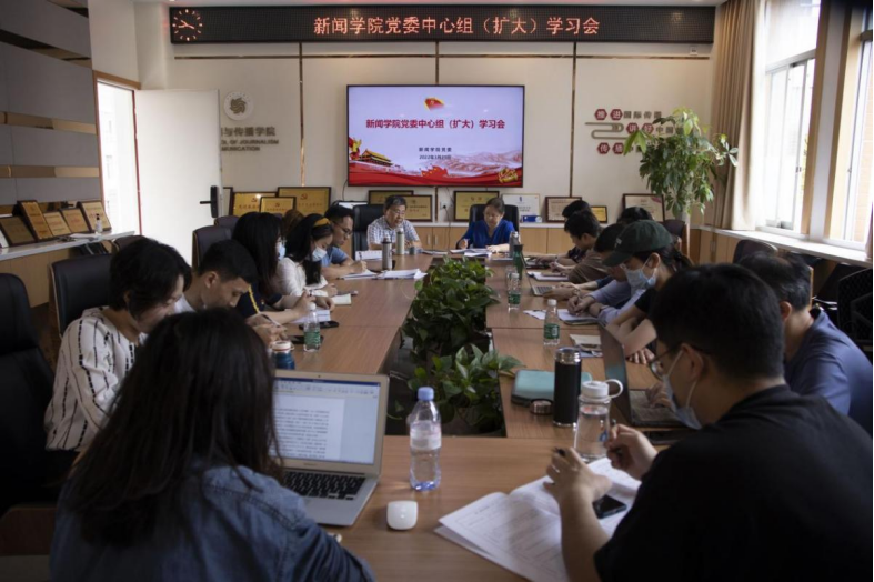 2022年3月21日上午,新闻学院在教学楼B403召开党委理论学习中心组(扩大)学习会专题学习2022年全国“两会”精神,学院党委委员、党政领导班子成员、系(中心)主任、办公室主任、党支部书记、组织员、辅导员参加学习。会议由学院党委书记郝建萍主持。