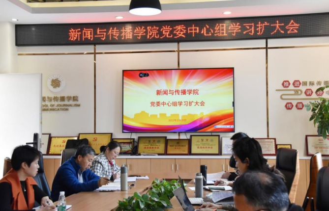 2022年2月28日上午,新闻学院在教学楼B403召开党委理论学习中心组(扩大)学习会专题学习研讨学生工作,学院党委委员、党政领导班子成员、系(中心)主任、办公室主任、党支部书记、组织员、辅导员参加学习。会议由学院党委书记郝建萍主持。