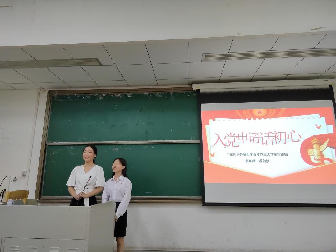 本网讯 2021年9月17日,新闻传播学院在教学楼C208开展党史学习教育专题活动,旨在帮助新闻传播学院青年们更好地学党史,悟初心,担使命。本次讲座由广东外语外贸大学百年党史大学生宣讲团主讲,主讲人分别是国际关系学院的李可晴同学、法学院的杨如梦同学,宣讲主题是“入党申请话初心”。新闻学院递交了入党申请书的2021级本科生和研究生新生140余人参加讲座。此次活动由由学院组织员、辅导员张维老师主持。