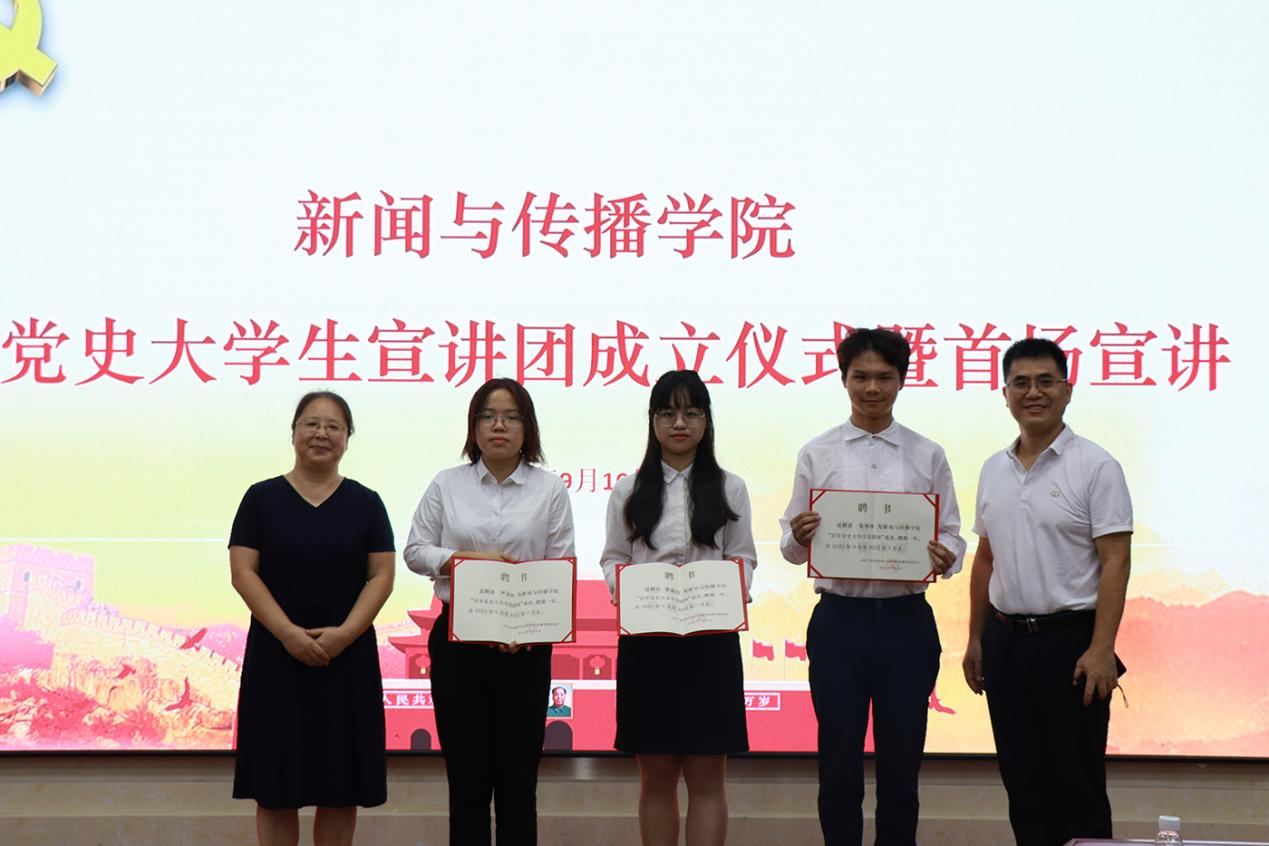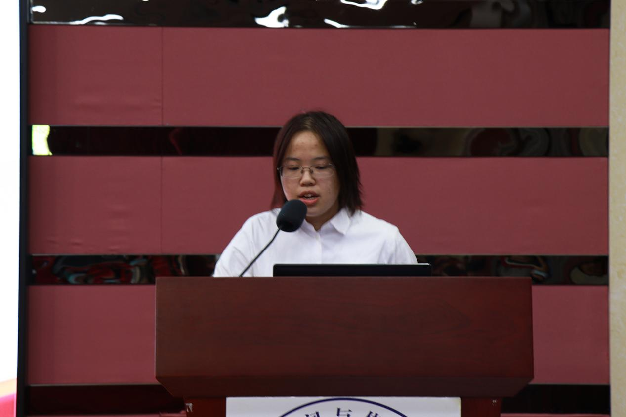 接着,党委书记郝建萍为宣讲团成员严凌昕、曹咏仪、朱育锋三名同学颁发聘书,在接受聘书之后,三名同学依次进行主题宣讲。