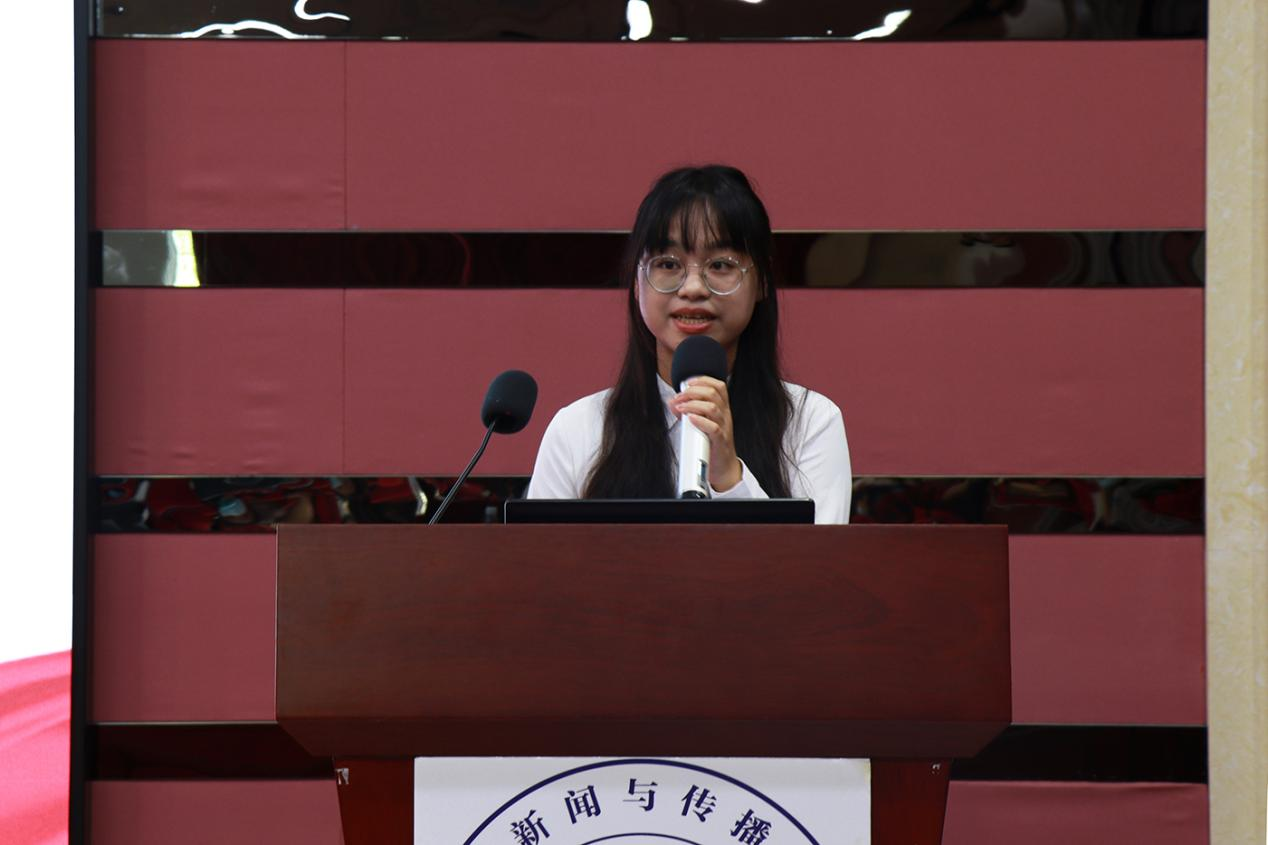 严凌昕以“志存高远,脚踏实地,行循自然”为主题展开宣讲。在暑假期间,严凌昕参加了学院组织的“讲好广东故事”新闻调查比赛,深入到了广东省湛江市雷州市开展调研。通过此次调研,她在基层看到了最真实的中国,在实践中提升了最真实的技能,亲身实践和深刻感受到在中国共产党的领导下乡村发展的巨大变化以及中国共产党践行“为人民服务”的初心。在最后,严凌昕与新生共勉,“大树长得高的前提是根扎的足够深”,只有多扎根,扎得深,才能在社会的广阔天地大展身手。”