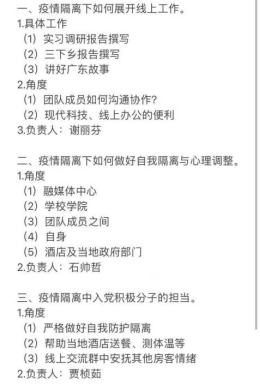 团队除队长谢丽芬在家居住外,其余五人均在酒店内,需要配合疫情防控工作,无法外出到达单位继续开展实习工作。学院党委副书记黄石胜得知情况后,立刻联络学院疫情防控小组,组织东源县融媒体中心办公室李丽青主任、东源学生团队成员及指导老师万婧博士开展线上会议。会议上,黄石胜副书记强调,要将安全摆在第一位,团队成员每人都要保持电话畅通,每天准时汇报个人体温及安全情况。除此之外,黄石胜副书记还提出要发挥团队成员入党积极分子的先锋模范作用,为抗疫做力所能及的事情。