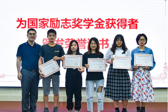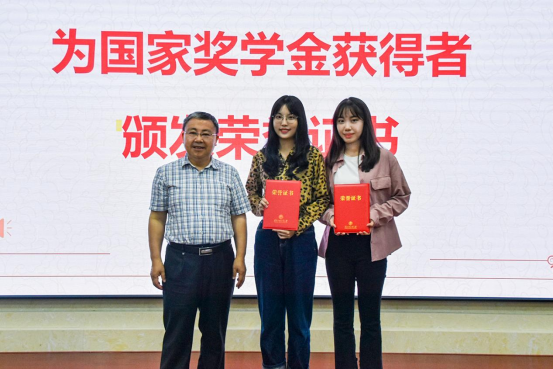 院长侯迎忠、党委副书记黄石胜分别为国家奖学金、国家励志奖学获得者颁发荣誉证书。