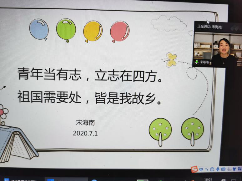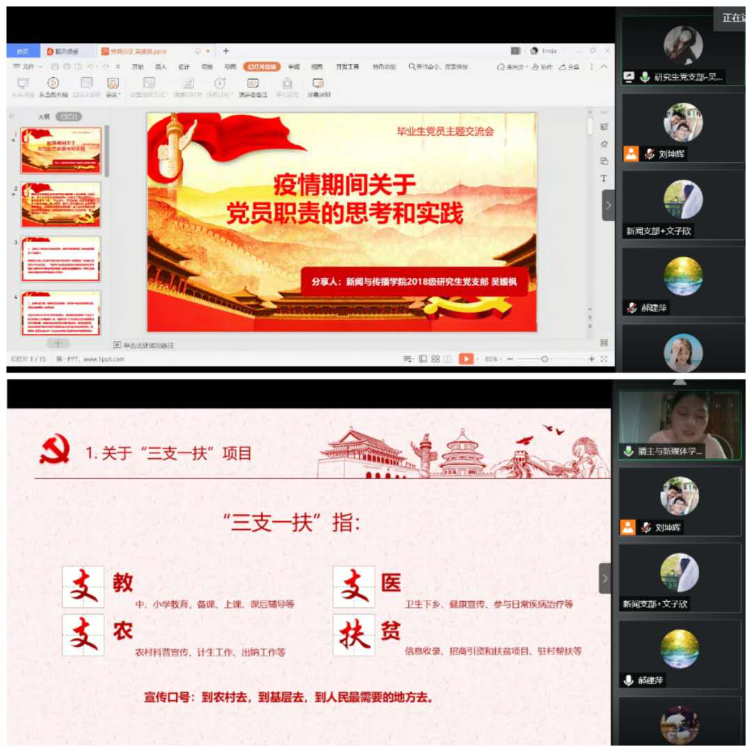 我校第五届研究生支教团团长、我院2019届毕业生宋海南同学分享了在黔西南布依族苗族自治州贞丰中学支教的收获、体会和感受,以及感人至深的故事。宋海南表示,无悔于自己的选择,用自己所学去帮助困难地区的孩子成长,是一名新时代大学生光荣的选择。她勉励毕业生党员“青春当有志、立志在四方。祖国需要处,皆是我故乡。”希望有更多的大学生能将青春奉献给时代最需要的地方。播主与新媒体学生党支部的2020届毕业生党员吴海玲同学介绍了她响应党的号召,参加了“三支一扶”项目,毕业后积极投身家乡建设的心路历程和对未来的期待。毕业研究生党员吴媛枫同学介绍了她不畏疫情,主动请缨,投入介休市北关街道体育路社区抗击新型冠状病毒肺炎疫情志愿服务,累计工作84小时的情况,以及参加线上辅导医务人员子女学习项目的活动情况。