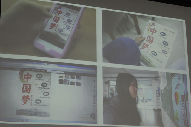 晚上气温较低,但是现场仍可见到许多赶来参加投票的同学,很多13级的同学甚至在现场为自己的班级展开拉票。“人能搏出一片蓝天”,首先为观众带来介绍的是新闻1101班,他们展示了为团日活动拍摄的微电影,通过纪录四位同学日常生活的转变,体现了中国梦对学习和生活的指导作用,视频中四位同学从不同的角度诠释了“中国梦”这一主题,其诙谐的表演让现场观看视频的同学笑声连连。