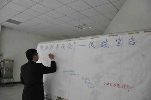 下午3点,E103课室外竖起了一块“低碳宣言”牌,到场的同学纷纷驻足牌前,挥笔留言。本次主题党日活动策划人钟晓芳表示,为响应“两会”所践行的“低碳”理念,交流会所发出的邀请函均只有半个手掌大小,而现场所有的领导名牌则都是用旧传单手写而成的。