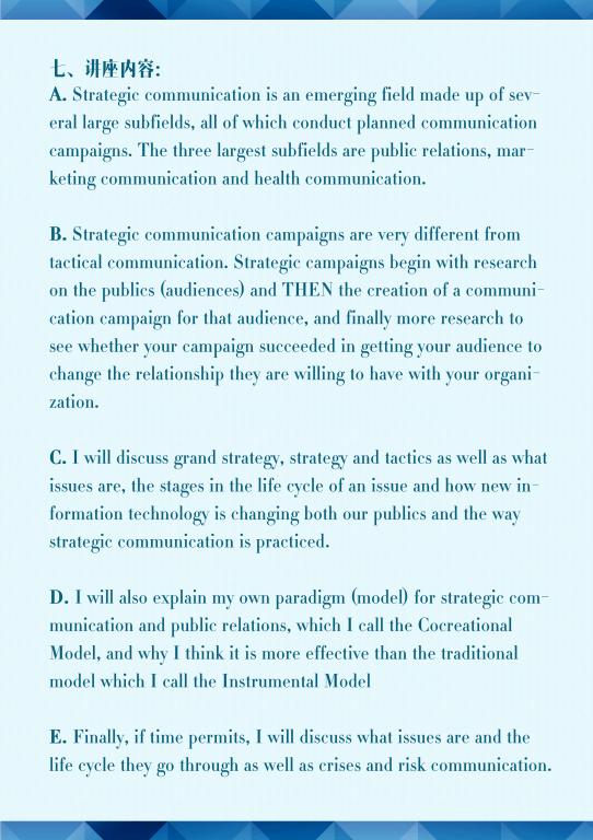 主讲人介绍:美国乔治梅森大学传播系终身教授,公共关系理论建设 的奠基人之一。