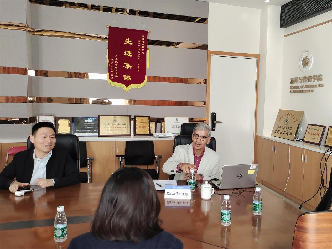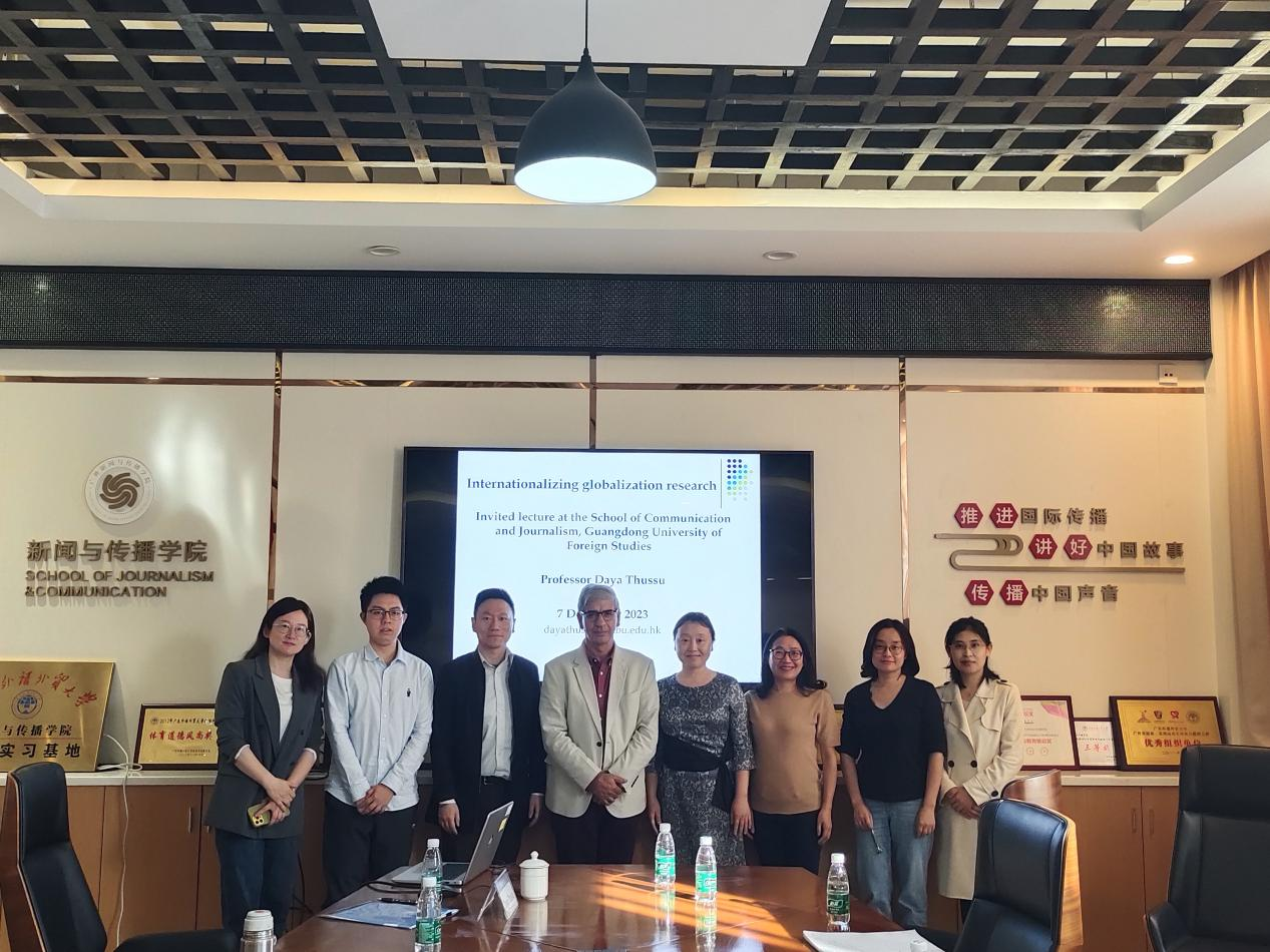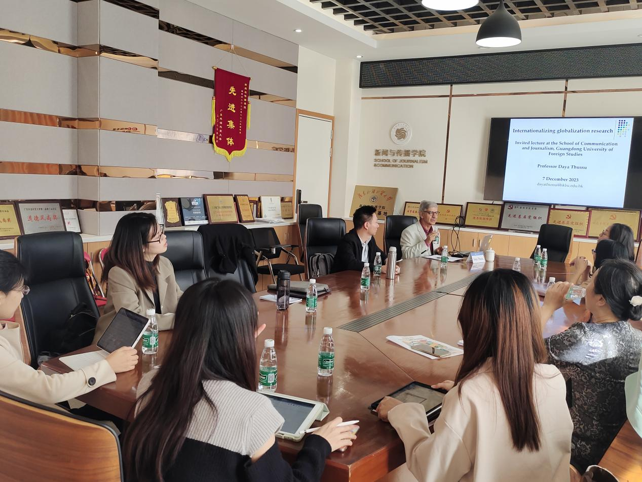 12月7日下午,世界知名国际传播学者、香港浸会大学新闻系教授、SAGE学术期刊《Global Media and Communication》创办人兼执行编辑达雅·屠苏(Daya Thussu)教授为新闻与传播学院教师和多语种创新班研究生同学带来一场以国际全球化研究和英文论文写作与发表为主题的讲座。本次讲座由新闻与传播学院院长助理、播音与主持艺术系系主任李峻岭副教授主持,学院教师杜慧贞副教授、周娟副教授、刘佩副教授、王雪晔副教授、王珂博士、曹钺博士等出席活动。