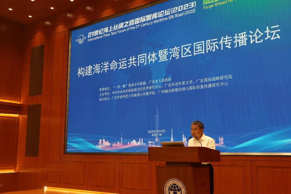 11月10日下午,由广东外语外贸大学新闻与传播学院和广州城市舆情治理与国际形象传播研究中心共同承办的21 世纪海上丝绸之路国际智库论坛(2023)平行论坛“构建海洋命运共同体暨湾区国际传播”在广东外语外贸大学白云山校区举行。来自中国人民大学、中国传媒大学、中国社会科学院新闻与传播研究所、武汉大学、北京师范大学、暨南大学、重庆大学、北京外国语大学、大连外国语大学和广东外语外贸大学等高校的专家学者,围绕“一带一路”倡议与国家形象、国际传播的价值基础,海洋命运共同体的理念、传播与影响,湾区形象塑造与国际传播等议题展开深入研讨。论坛由广东外语外贸大学新闻与传播学院院长侯迎忠教授和副院长罗坤瑾教授共同主持。