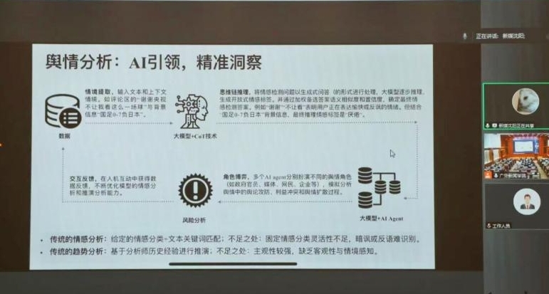 华中科技大学新闻与信息传播学院党委副书记、教育部大数据与国家传播战略实验室执行主任李卫东教授以“基于大模型的智能云传播应用与寰球民意可视化分析”为题,介绍了人工智能的三大流派和大模型的三种分类,以及大模型时代人机协作的三种模式,并指出大模型应用面临着应用便利与数据隐私、问答真实与模型幻觉,以及模型偏向与公共价值等矛盾。最后,他详细介绍了其实验室所发布的寰球民意“百晓生”智能体、智能交互地图和指数可视化分析系统等产品,为舆论学研究深入了解全球民意提供了智能、便捷的工具。