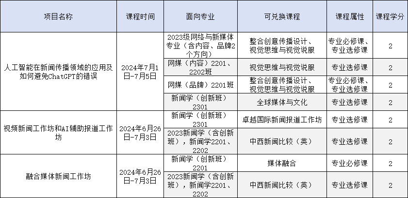 新闻学院2024年“SPARK”高水平暑期研学项目有三项,《人工智能在新闻传播领域的应用及如何避免ChatGPT的错误》、《视频新闻工作坊和AI辅助报道工作坊》及《融合媒体新闻工作坊》,每位同学限报一个项目,每个项目的课程详情见附件1。