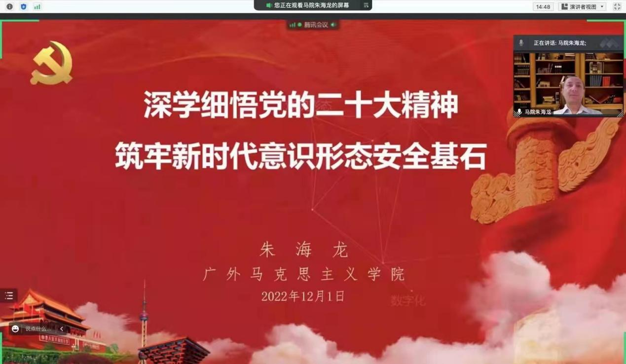 新闻学院与高翻学院开展党的二十大精神联学活动,邀请马克思主义学院朱海龙教授以《深学细悟党的二十大精神、筑牢新时代意识形态之基》为主题开展宣讲。朱海龙教授全面系统阐述了党的二十大报告的重要内容和丰富内涵,并从“什么是意识形态”、“意识形态工作为什么极端重要”、“把握意识形态工作的六个维度”等几个方面阐述了如何做好新时代的意识形态工作。最后,朱海龙勉励全体学生,要认真学习深刻领悟党的二十大精神,坚定理想信念,筑牢信仰之基,为实现中华民族伟大复兴贡献青春力量。