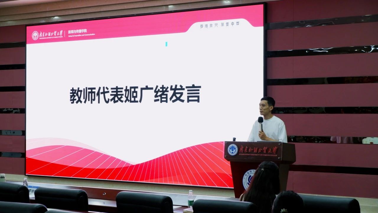 接下来,我院硕士生导师、云山青年学者姬广绪副教授作为教师代表面向全体本科新生进行发言。在发言中,姬老师表示广外新闻学院的学科发展与国家战略发展密切相关,而我院老师参与了新媒体国际传播与社会治理、湾区国际传播研究等等学科项目,此类项目都与国家包括大湾区发展有着紧密联系。因此,姬老师认为我们的新生需要具备一种家国情怀,秉持对家庭的关爱和对国家的热爱,同时也积极地为社会做出贡献,成为一个有情感、有责任感的优秀青年。