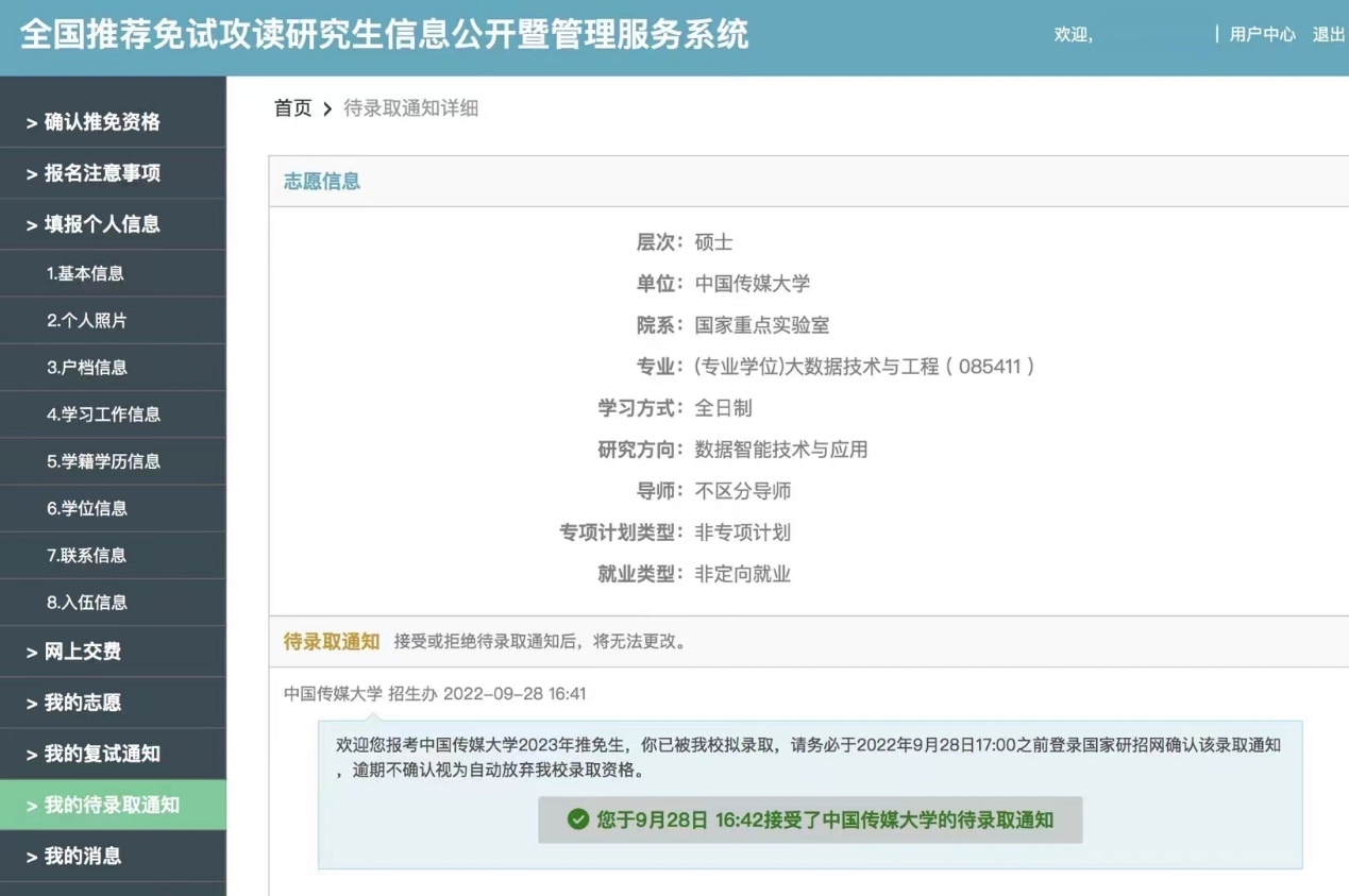 确立了新的目标,陈盛晖也开始了新的努力。成绩本就十分优异的他,对学习更加看重了。“由于保研名额的不确定性,我当时对学习成绩尤为重视,花了很多时间进去,根本不敢放松。”终于,功夫不负有心人,一年后的9月28号,陈盛晖也收到了梦想学校的录取通知,成功保研至中国传媒大学媒体融合与传播国家重点实验室大数据技术与工程专业。
