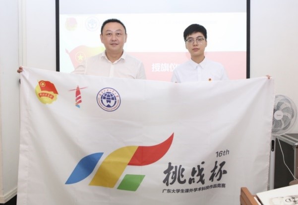 校党委副书记唐锐(左)向陈盛晖(右)授旗