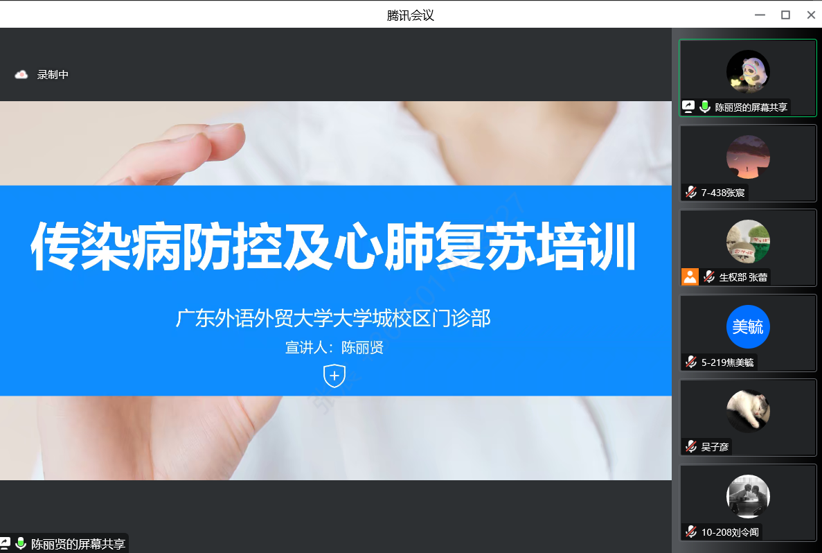 校门诊部陈丽贤老师首先进行疫情防控及急救知识技能培训。在疫情防控方面,她向宿舍长们介绍了传染病的定义、特征、流行过程以及传染病的防控原则,并重点阐释了学校重点防控传染病及其防控措施,针对不同的传染病为同学们提供了相应的预防措施,帮助同学们更好地认识传染病、理解传播途径并进行有效防护。在急救知识技能培训方面,陈丽贤通过视频带领同学们直观地学习了心肺复苏的方法,提高了同学们急救的能力。