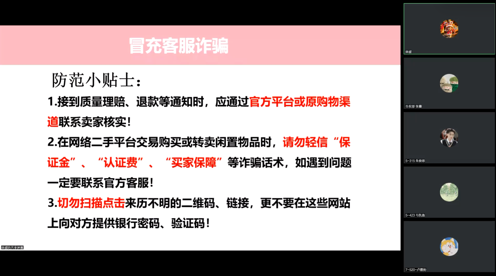 校保卫处陈媛老师随后进行了防诈骗及宿舍消防安全培训。她主要介绍了冒充客服诈骗、冒充公检法诈骗以及刷单兼职诈骗等在大学生群体中高发的诈骗手段,并提出了相应的防范方式。陈媛表示,大量的境外诈骗人员与银行账户使得公安机关的抓捕工作困难重重,即便报警也很有可能无法追回钱款,因此她提出“事前防范胜于事后补救”。在消防安全方面,她主要强调了电动车的充电安全问题,并介绍了火灾时的自救方法以及灭火器的使用方法,加深了同学们对相关知识的印象。