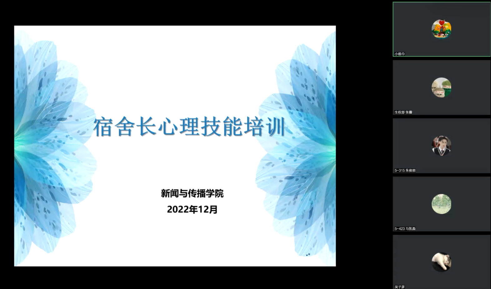 本网讯12月8日下午,新闻与传播学院通过腾讯会议举办线上宿舍长培训活动,学院党委副书记涂颖、全体辅导员以及全院140余名宿舍长参加本次培训活动。