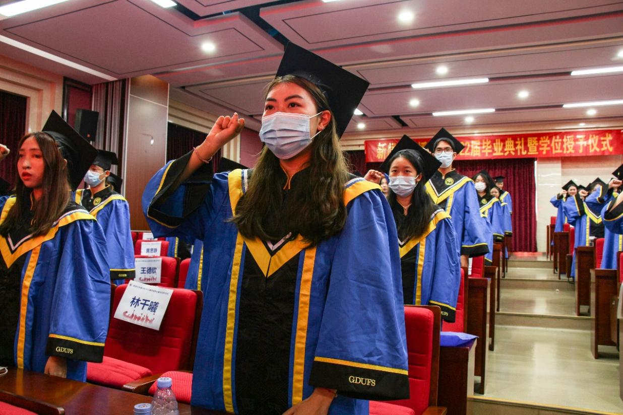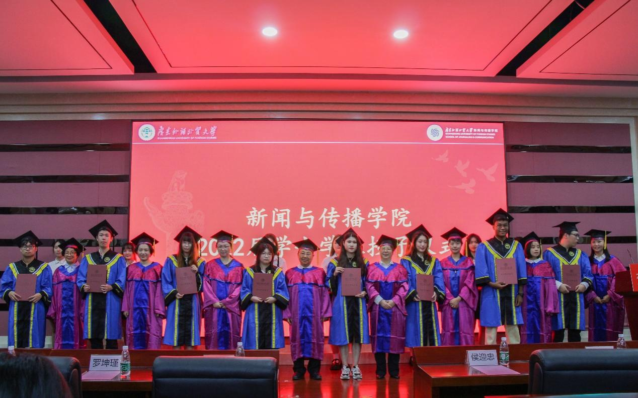 毕业生身穿学士服、头戴学士帽,在这里完成了他们在广外新传的最后一课。在奏唱国歌、毕业生宣誓、优秀学士颁奖后,在庄严厚重的礼仪乐中,学位授予仪式正式开始,130名毕业生依次走上台,导师们为他们一一拨穗、颁发学位证书、合影留念,寄予对毕业生未来之路的浓浓祝福。