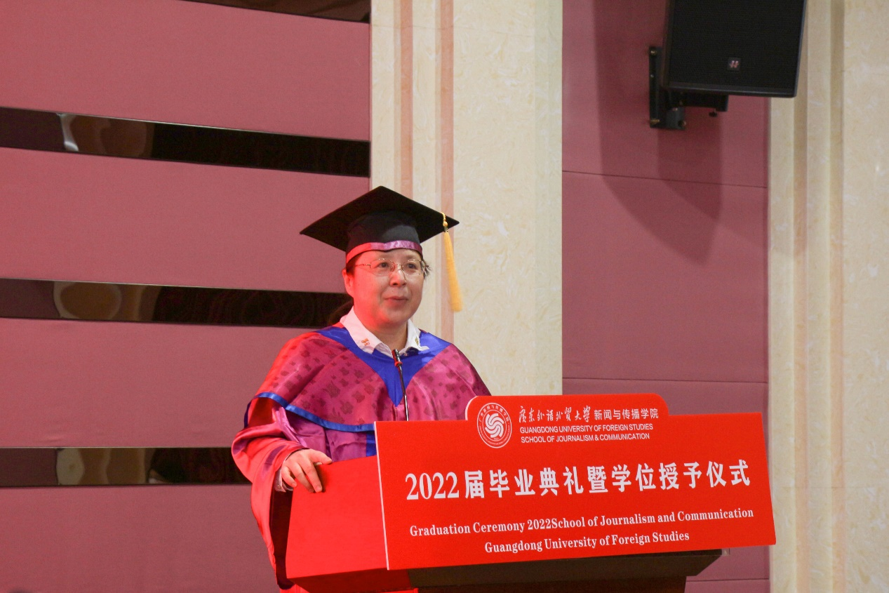 毕业生代表、优秀学士徐睿代表毕业生发言,她代表全体毕业生对领导、老师、同学,父母家人致以诚挚的感谢。她回顾了四年来从入学到毕业以来在广外新闻学院的的美好记忆,“我们为pre熬过夜,为大作业秃过头。通过模拟新闻发布会,我们努力去触及最真实的新闻现场”。她希望大家能够保持独立,保留人文关怀的赤子之心,不忽略那些需要爱和关怀的角落,谨记新闻人的责任与使命,为“让无力者有力,让悲观者前行”的目标而奋斗。