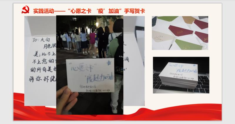 新传2102团支部朗诵了《纪念五四》,使人回忆起觉醒年代的热血青年们,他们手写温情贺卡,赠送给奋战在抗疫一线的工作人员,表达了他们的关心与敬佩之情;他们还给环卫工人赠送精美制作的曲奇饼干以表示诚挚的慰问。