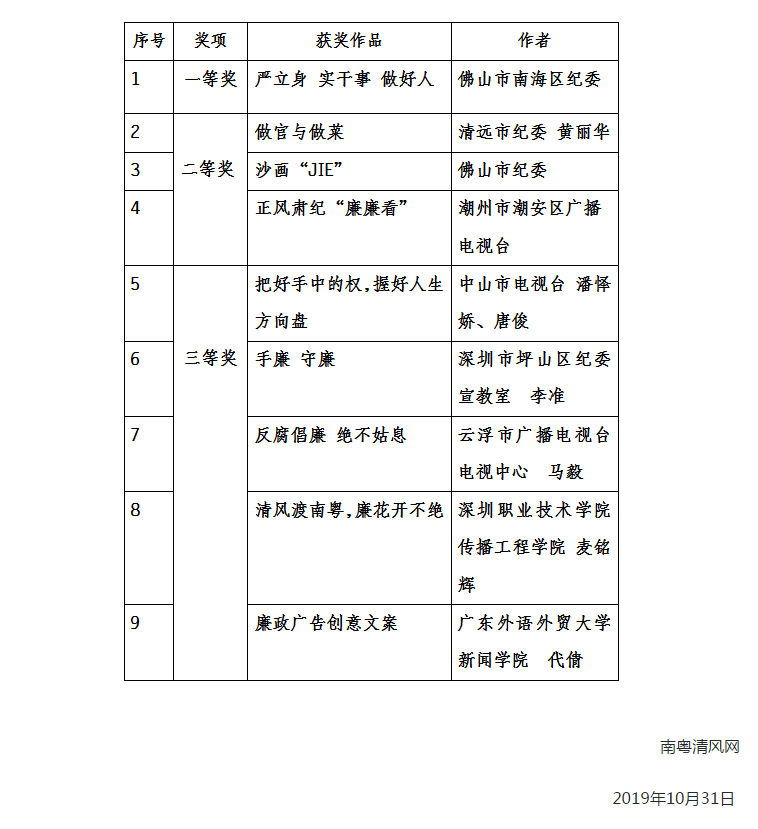 2019年初,为集中民智推动廉洁化风成俗,由中共广东省纪律检查委员会,广东省监察委员会主办的南粤清风网,面向社会开展“南粤清风”廉政公益广告创意征集活动。此次活动重点征集视频类廉政广告创意,创意文案、广告语以及正在筹拍或近年拍摄完成的廉政公益广告。比赛最终评选出一、二、三等奖和优秀奖,我院新闻1802班代倩获三等奖,其中进入获奖名单的学校单位仅两名。