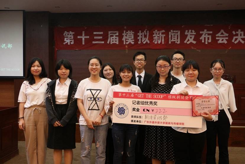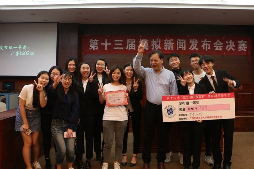 本网讯 4月26晚,第十三届“GET THE SCOOP”模拟新闻发布会决赛在实验楼B307举行。在近三个小时的全力比拼后,广告1602班队伍夺得发布组冠军,而记者组的桂冠落在广外新闻社全媒体记者组。