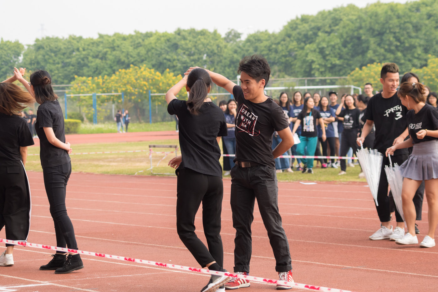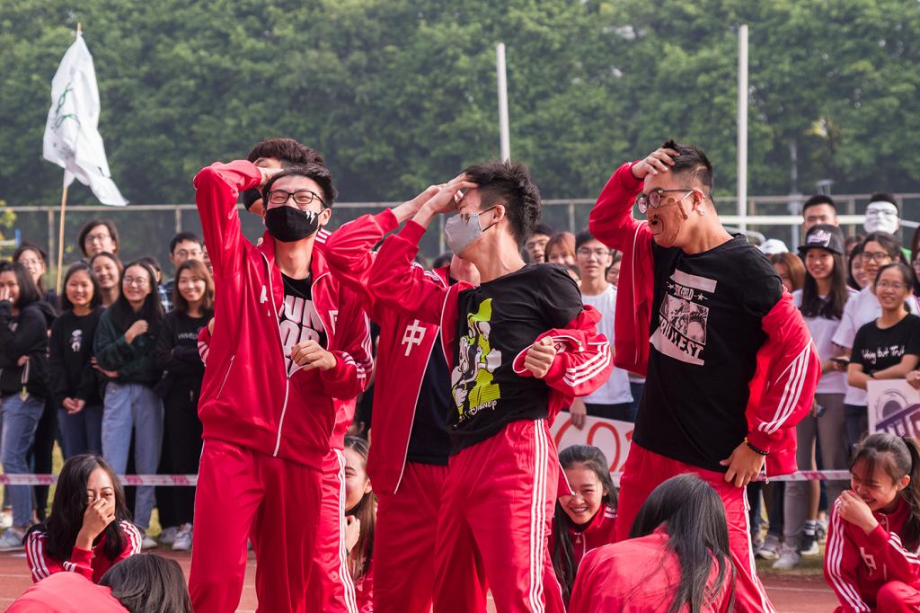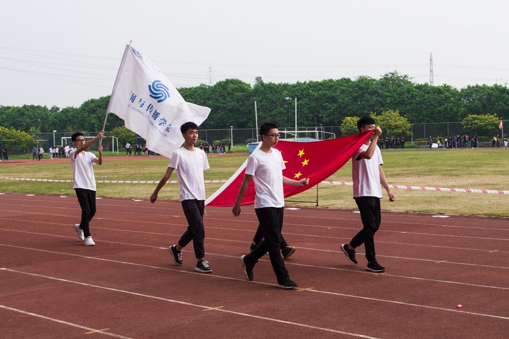由四名升旗手抬着国旗、一名旗手高举院旗组成的方队踏着整齐的步伐,从主席台前走过,向观众们展示着新传学子的英姿。新闻1501班紧随国旗方队走到主席台前进行表演,音乐由广播体操迅速切换为儿歌,而他们的舞蹈也立刻转换风格,赢得大家的阵阵掌声。