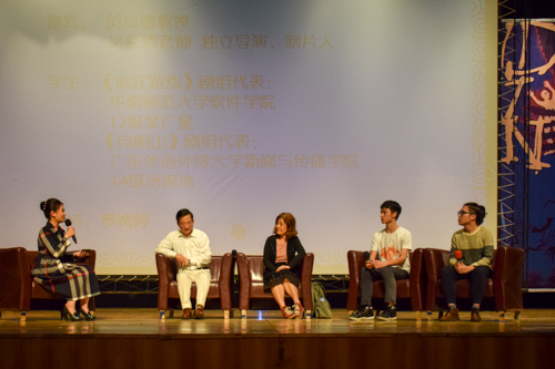 圆桌论坛嘉宾及主创代表:新闻与传播学院於贤德教授、吴慕青导演、《向阳山》剧组代表汤锦沛(广东外语外贸大学新闻与传播学院14级学生)、《疯狂游戏》剧组代表吴广星(华南师范大学软件学院12级学生)