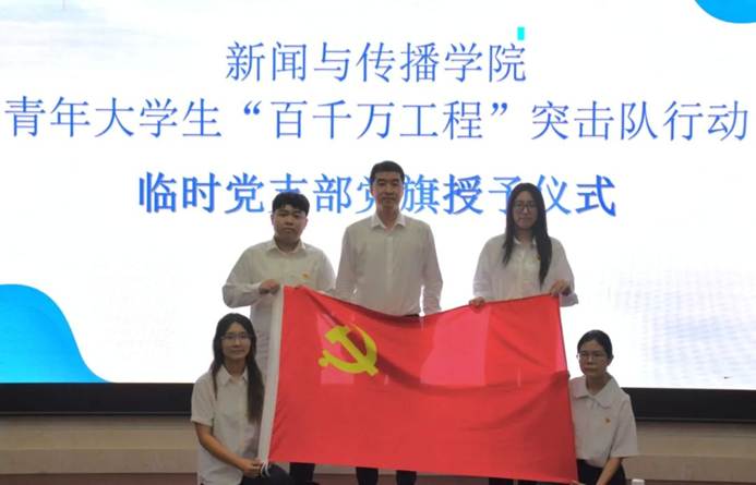 在培训开始前,商杰强给“百千万工程”突击队行动临时党支部授党旗,涂颖给学生团队代表授“百千万工程”突击队行动队旗。