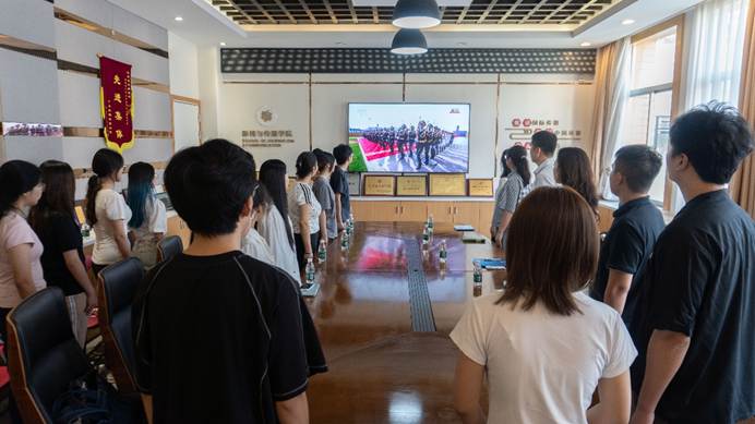 广东外语外贸大学新闻与传播学院党委在教学楼B403组织党员和师生代表观看阅兵式。本次活动以“观阅兵盛典,砺报国初心”为主题,机关党委组织员五级职员(主持新闻与传播学院党委工作)商杰强、学院党委副书记涂颖、党员师生代表齐聚一堂,共同缅怀革命先烈,感悟新时代中国强军强国伟力,凝聚爱国奋进力量。活动由辅导员熊仕经主持。