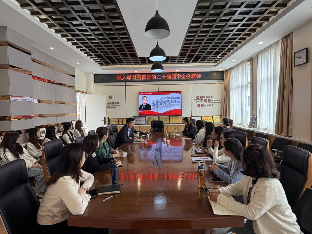 2025年12月10日,新闻学院党委举办党的二十届四中全会精神宣讲,围绕“以经济建设为中心,推动高质量发展——深入学习贯彻党的二十届四中全会精神”主题进行深入学习。会议特邀广东国际战略研究院(丝绸之路研究院)执行院长韩永辉教授作专题辅导报告。学院党政领导班子成员、师生党员代表参加学习,学院党委书记商杰强主持会议。