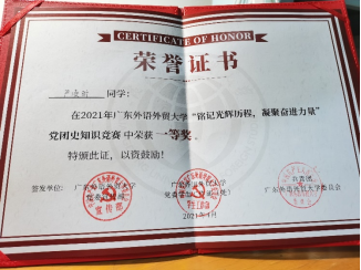 经过三轮比赛的激烈角逐,严凌昕同学最终获得“铭记光辉历程,凝聚奋进力量”党团史知识竞赛的一等奖。