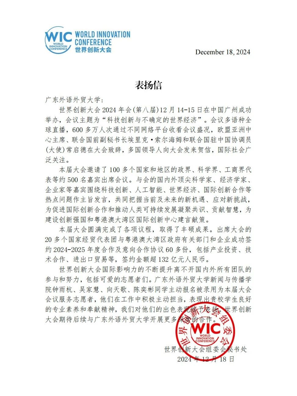 在整个会议进程中,广外新闻学院的志愿者们凭借卓越的表现,赢得了会场嘉宾们的广泛赞誉。志愿者们不仅展现了高度的专业素养,还彰显了无私奉献的精神风貌。鉴于他们在活动中的出色表现,组委会致函学校,对四位志愿者的辛勤付出和卓越贡献给予了高度评价,并表达了与广外进行下一次合作的热切期待。