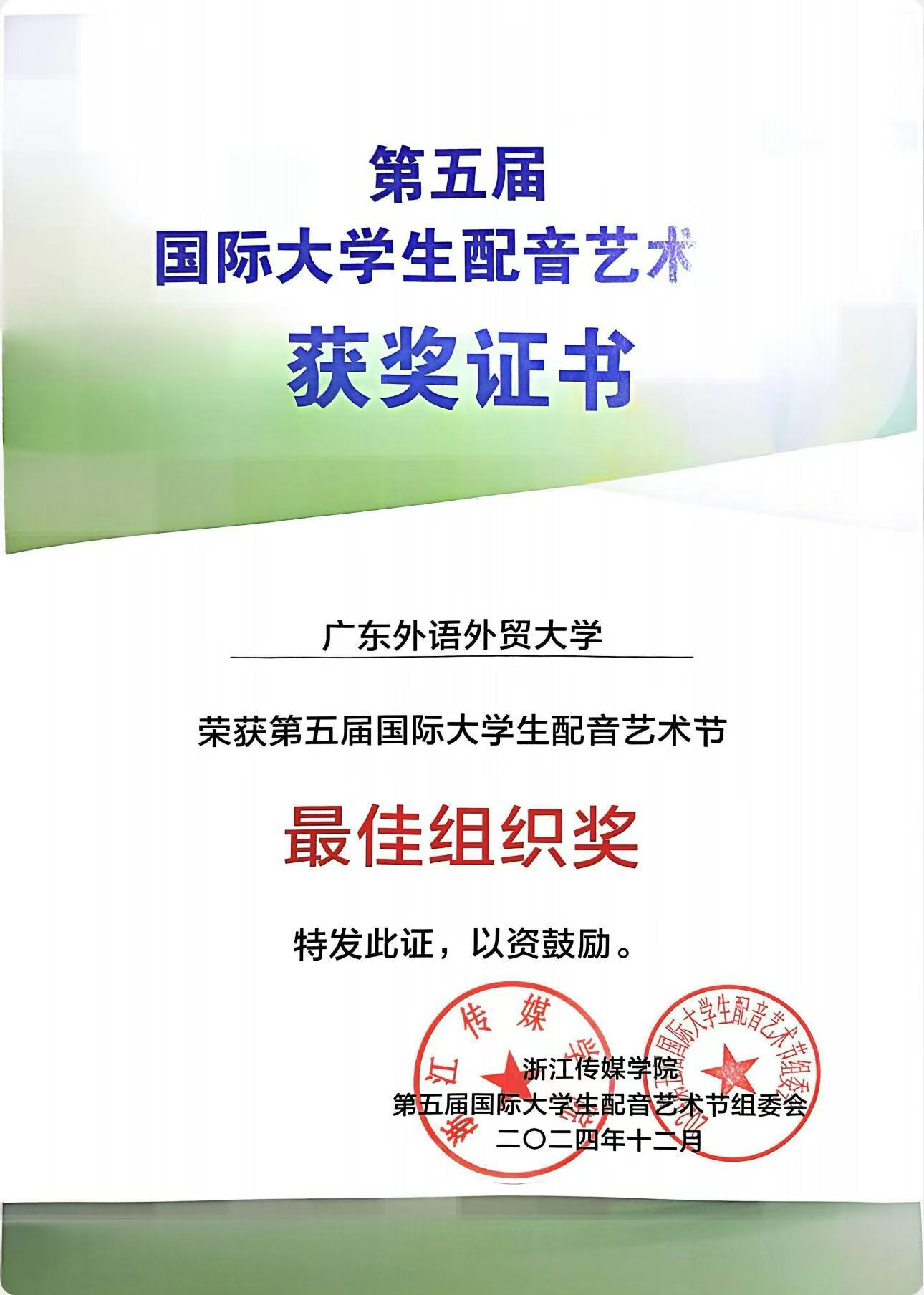 由广外新闻学院播主专业21级学生刘皓麟和22级学生吴亚男、汪健三人组成的“电钻突突队”顺利获得了线下参赛机会,并在半决赛中以全场第一的成绩晋级总决赛,最终取得了第五届国际大学生配音艺术节影视赛道全国一等奖的好成绩,广东外语外贸大学也获得本届大赛最佳组织荣誉称号。