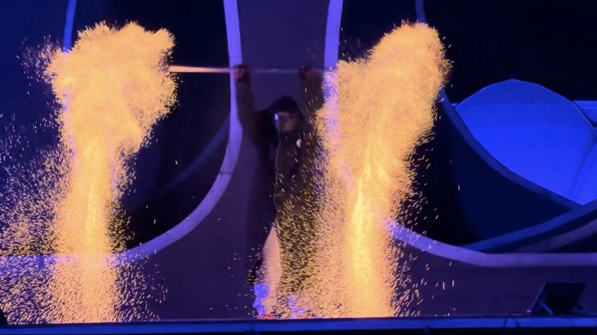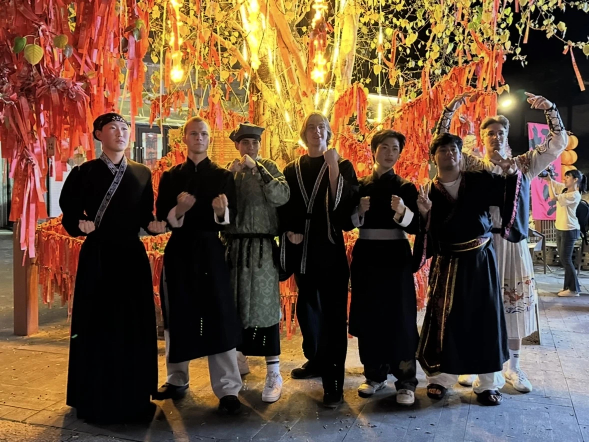 夜幕低垂,研学团在禅域小镇迎来了一场别开生面的火神节盛宴。舞台上,技艺精湛的舞火艺人挥动火壶,烈焰划破夜空,引得全场欢呼雷动;祈福许愿树下,来自各国的学子们虔诚系上心愿绸带,用指尖轻抚祝福寄语,感受着这份跨越文化的温暖情谊。留学生们身着汉服,手持火把,跟随巡游队伍穿行在古色古香的街巷间。随后,留学生与当地居民手挽着手,围着熊熊燃烧的篝火欢快起舞。巴西女孩Agnes(林叆斓)难掩兴奋之情:“晚会的气氛非常热烈!我们虽然来自不同国度,此刻却像家人一样亲密无间。我还认识了祈福文化中的‘万事胜意’祝福语,对中国文化有了更深的理解。”