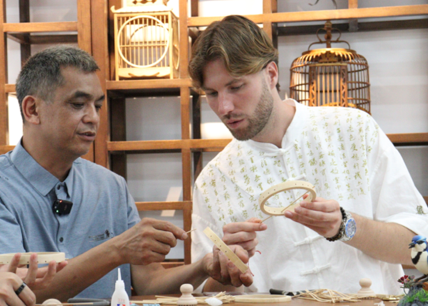 实践团还聚焦非遗项目的青春化表达。在中外学生共同探访省级非遗龙窑与沙河鸟笼传承工坊期间,团队跳出传统记录框架,策划“留学生翻转课堂”——由外国学生教中国学生制作鸟笼灯文创,并录制全英文教学视频。镜头中,留学生以粤语喊“师傅”、用普通话交流技艺趣闻,古老手艺与青春创意碰撞出别样火花,实现了非遗文化在国际语境和年轻群体中的“软传播”。