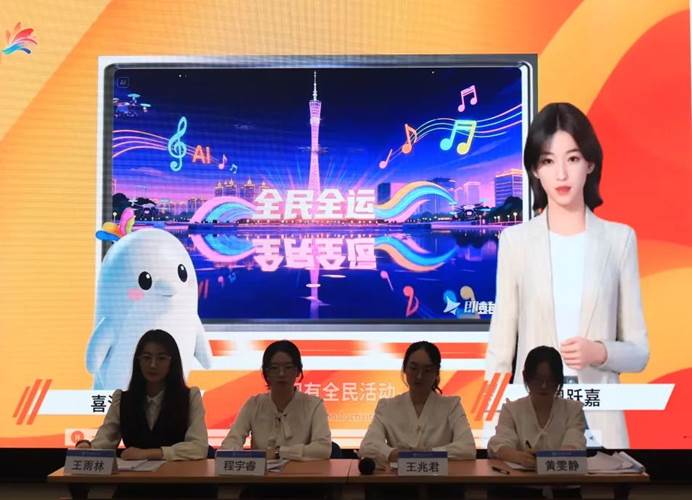 为探索智能媒体时代新闻教育创新路径、打造沉浸式新闻实践课堂,本届首创真人主持+AI数字人双轨播报模式,运用动态数据可视化、AI数字人协同播报等前沿技术,展现新时代新闻教育的创新突破。模拟新闻发布会深度融入数字人播报技术,在未成年网络使用”“全运会嘉年华等虚拟场景中,提升学生数字叙事力与多模态传播素养。