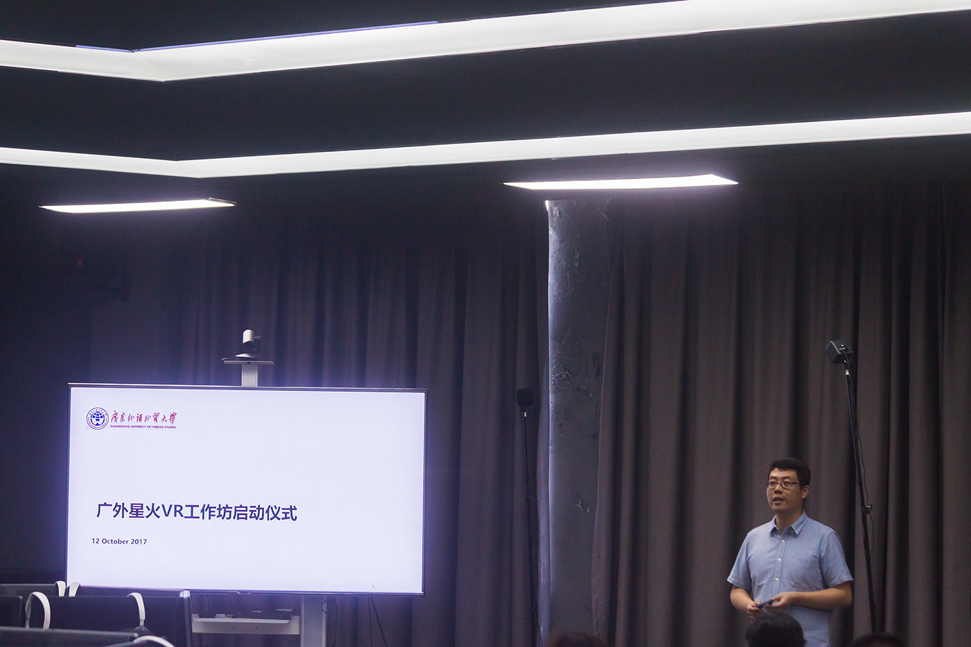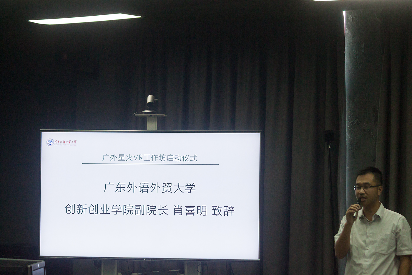 介绍出席人员后,姜熙提出,希望在广外星火VR工作坊的推动下,促进新媒体技术教学与创新创业教学以及卓越国际人才培养相结合的愿景。