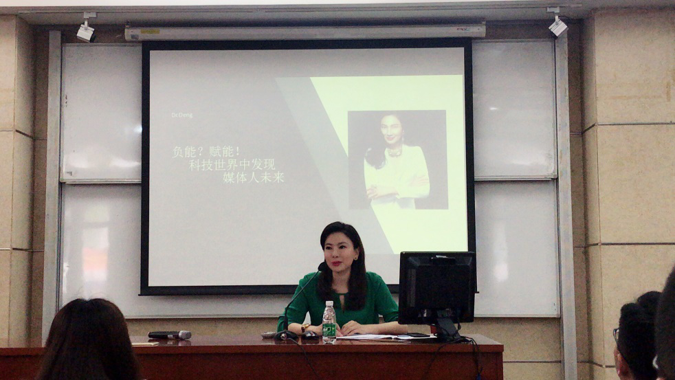 如今,科技的发展为媒体行业带来了新的挑战,机器人写作的出现逐步代替了通讯员,大数据分析技术也慢慢取代人工数据统计。邓璐表示,媒体人要顺应科技时代的发展,让人工智能为我所用。课堂上,邓璐也跟大家分享了她在主持活动时与人工智能机器人有趣的故事。